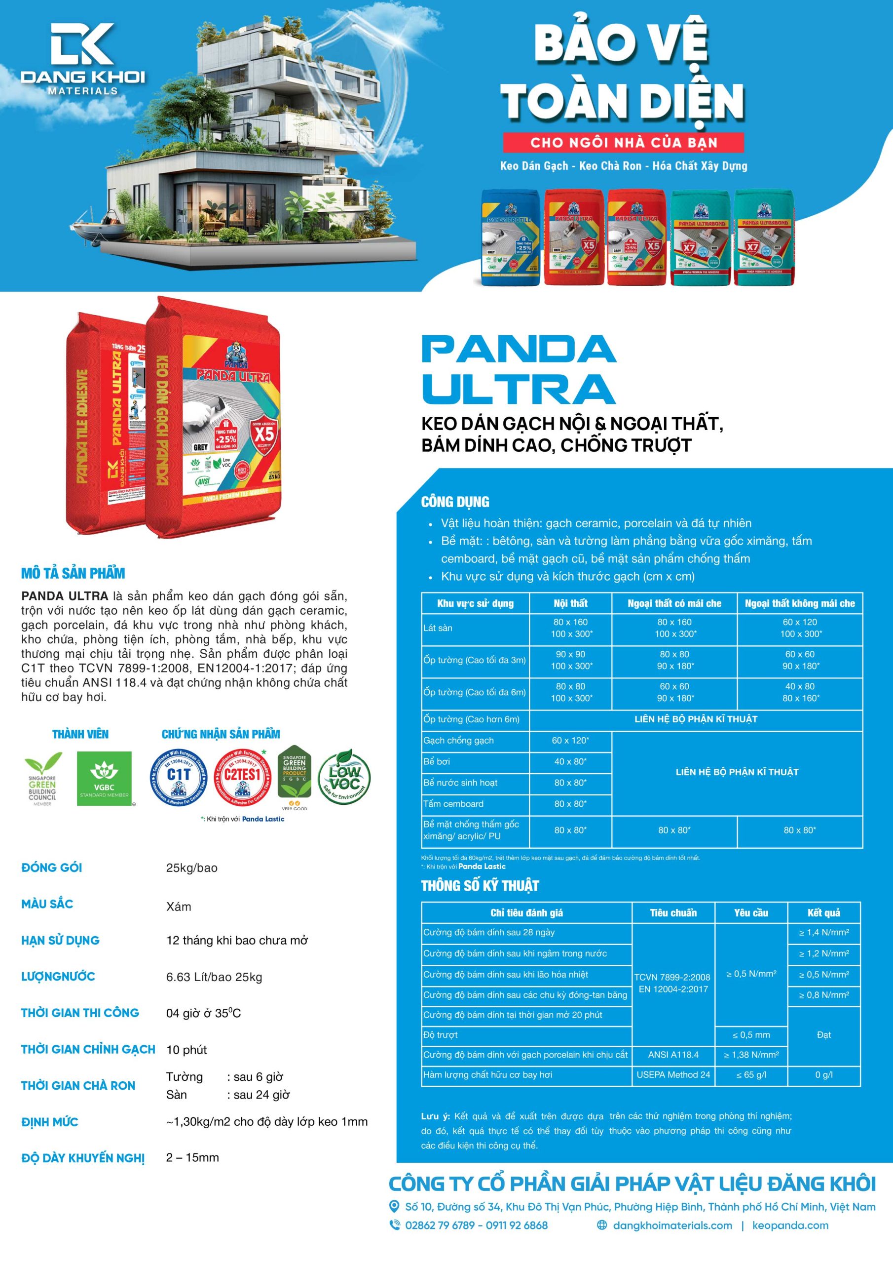 Keo Dán Gạch Panda Ultra là dòng sản phẩm keo dán gạch gốc xi măng cao cấp, đóng gói sẵn, được thiết kế đặc biệt để thi công các loại gạch ceramic, porcelain, đá.