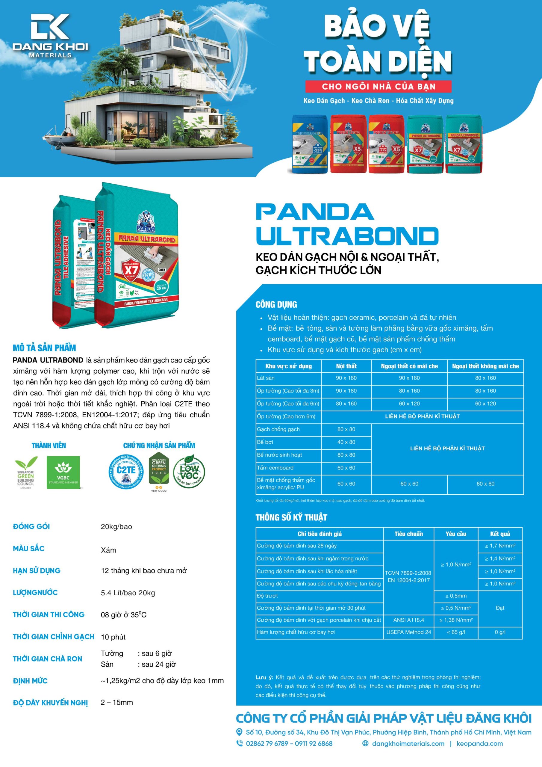 Panda UltraBond là keo dán gạch cao cấp gốc xi măng với hàm lượng polymer cao. Khi trộn với nước, sản phẩm tạo thành keo dán lớp mỏng có cường độ bám dính cao và thời gian mở dài, lý tưởng để thi công ngoài trời hoặc trong thời tiết khắc nghiệt.